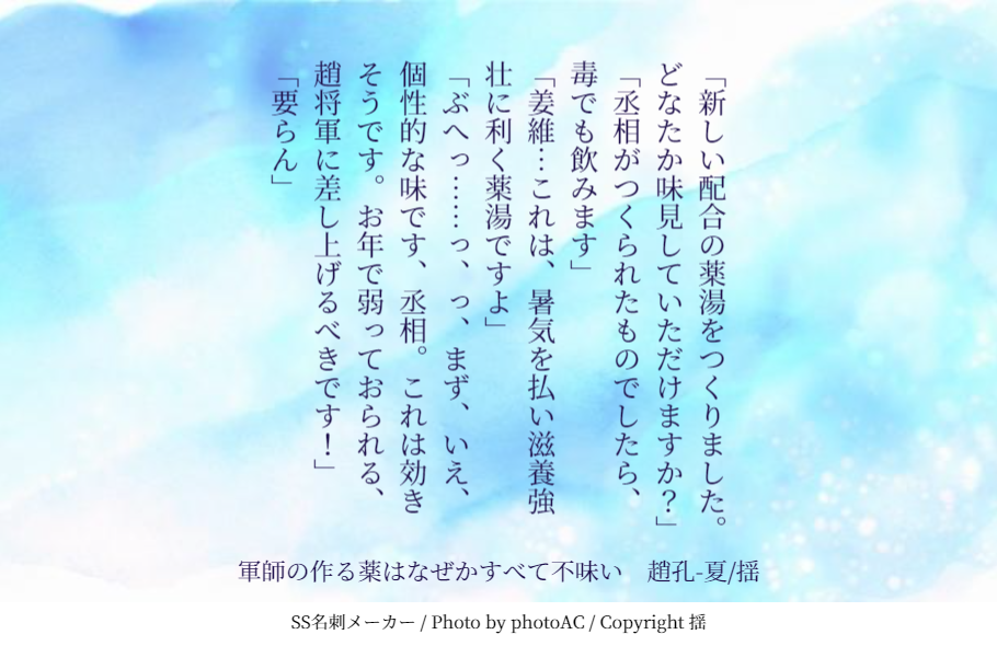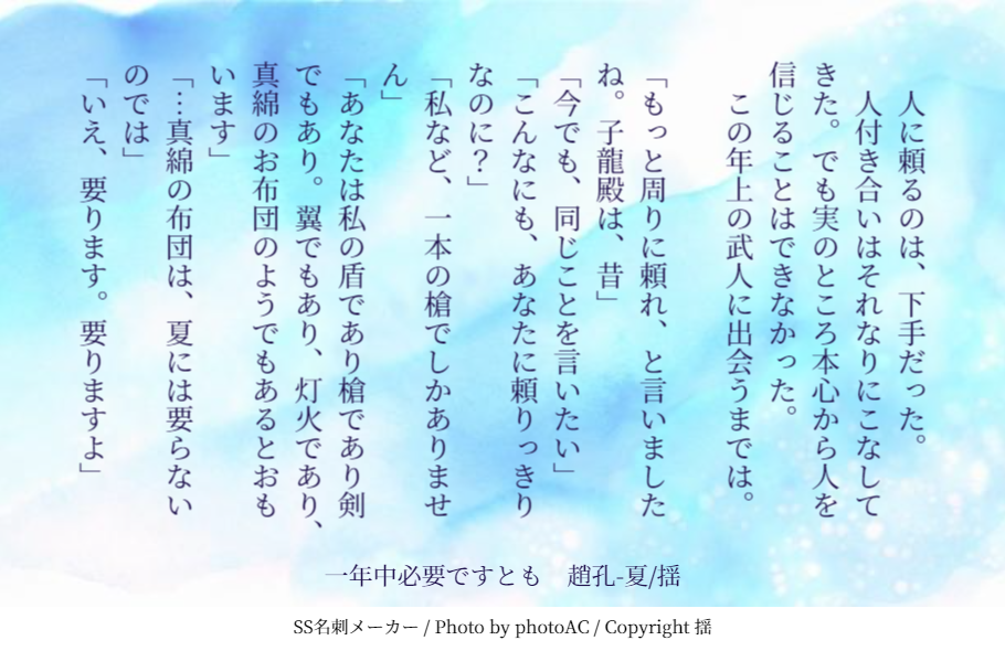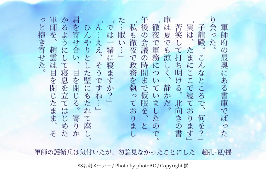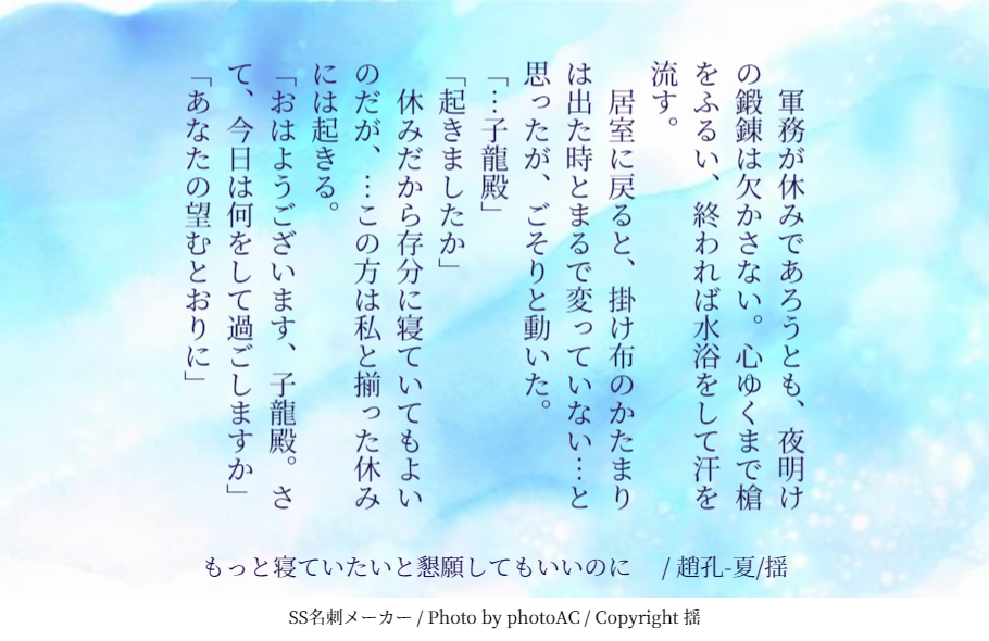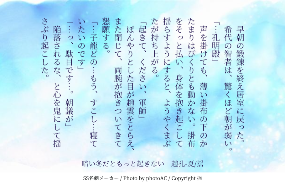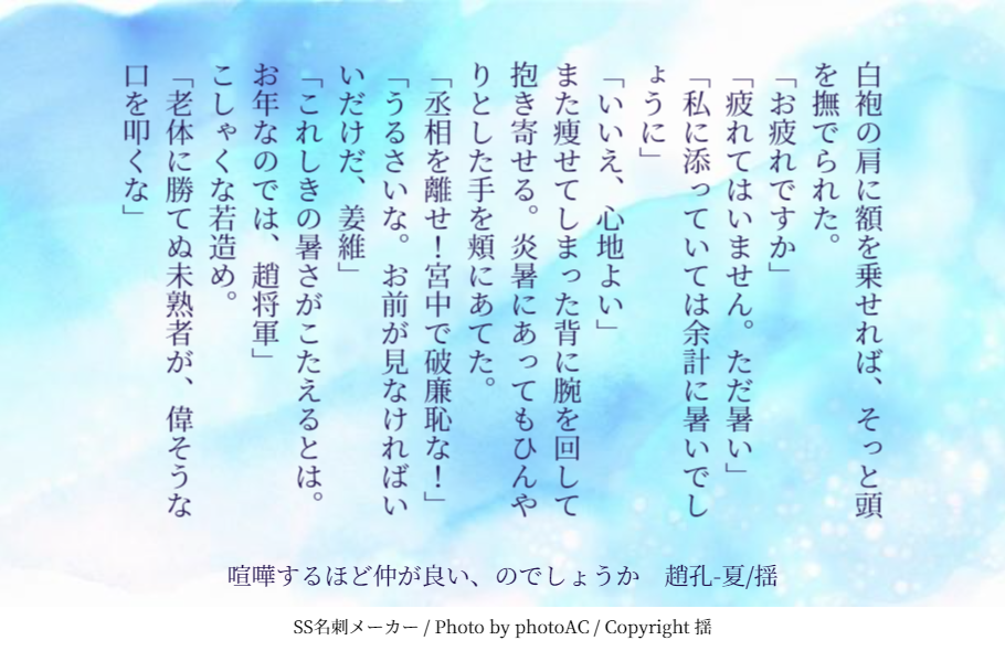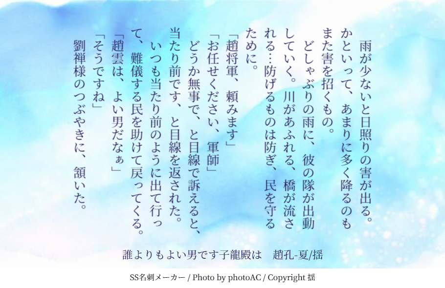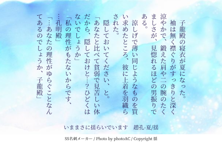 「主公に続いて張飛殿が『あにじゃあぁぁ』と叫ばれ飛び込まれまして。その後も『劉備様ぁ』『ひゃあ~っほう』と兵卒らが次々と飛び込んでお祭り騒ぎになりかけたところ―――関羽殿が静かにざぶざぶと水に入られました。その雄々しくも威厳あふれるご様子に、兵卒らがはっと息を呑み―――関羽隊の皆さんが粛々と儀式のように厳かに入水されるよし、これは『ひゃっほう』派はもう時代遅れ、これからはざぶざぶ派の時代到来か……という空気が濃厚に流れましたところで、さて私も清らかな水で汗を流そうと衣を脱ぎかけたところ、泳いでおられた主公が、ぎょっと目をむかれて『待て、孔明!!お前は脱ぐな!!脱ぐな!!!脱ぐな!!よいか、脱ぐな!!!絶対に脱ぐな!!!』―――と5回も脱ぐなと怒鳴られまして。いささか啞然とした私が、『…何故でしょうか、主公』と問うたところ主公は『いや、なんかマズイだろ、いやなんか、おいまずいよな趙雲、いや趙雲は別動隊だった、よけいまずい』と錯乱気味になられ、張飛殿がみかねて『兄者、あの貧弱鶏ガラ野郎にも脱ぐ権利くらいあるだろ』と取りなしてくださったのですが。たいそう疎外感に打ちのめされました、私は…。武将の方々にくらべれば貧弱でしょうが、隠しておかなければいけないほどでしょうか。趙将軍は、どう思われます?主公は水から上がられたあと小声で『おまえは趙雲以外の者の前では脱ぐな、孔明』と仰せでしたが、趙雲殿、脱いでもよいでしょうか。衣を着て水に入ると重くて」