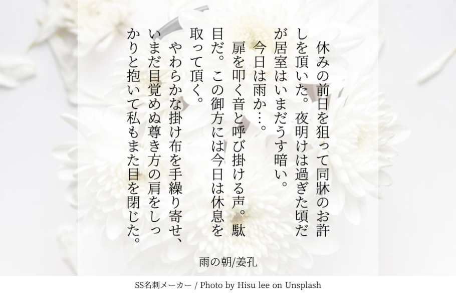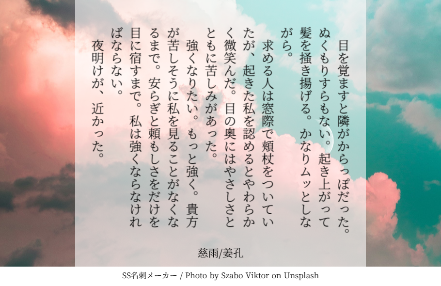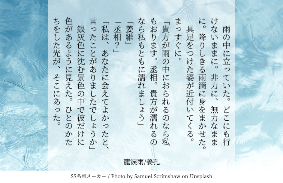 外へと一歩を踏み出すと雨に包まれた。今日は冠をつけていない。重い袍も着ていない。それだけで身は軽やかでどこにでも行けそうな気がした。