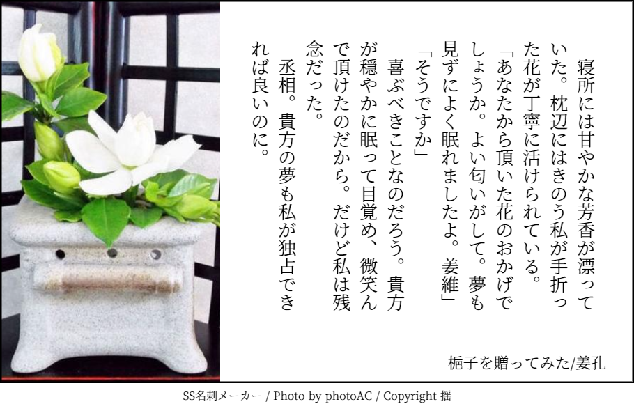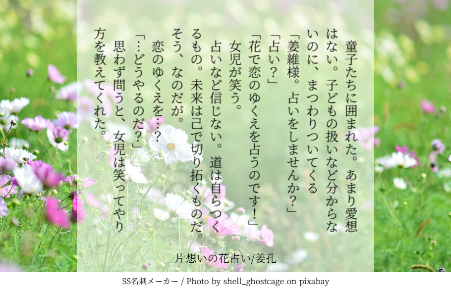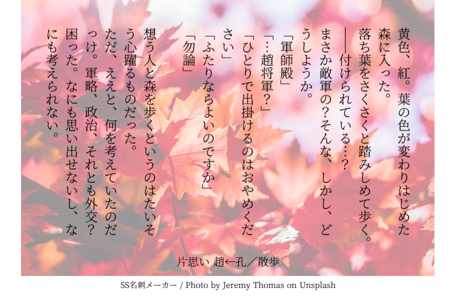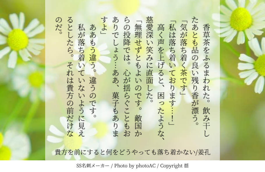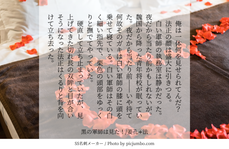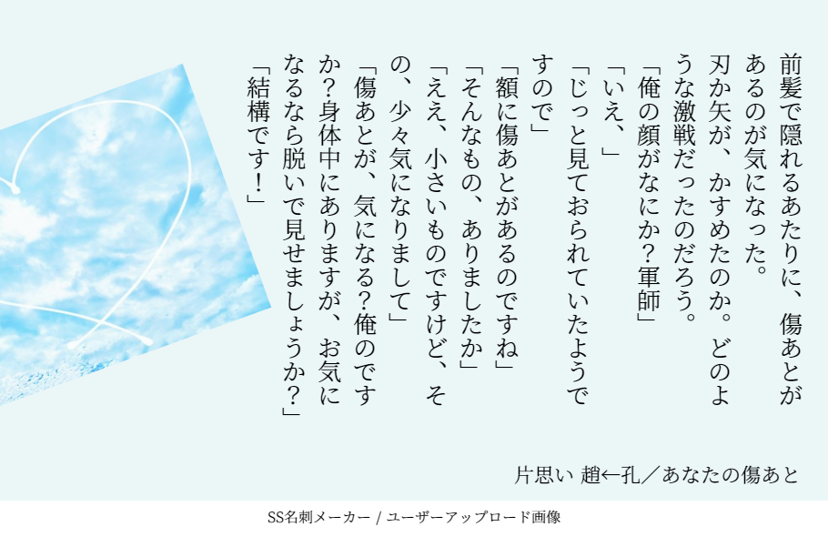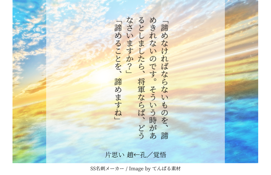 趙雲の汲んだ水で洗顔し、髪を結って衣装を整えた軍師は、身をひるがえして外に出た。扉の外にて、ゆっくりと振り返る。